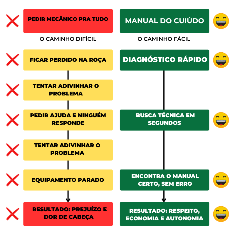 • Milhares de manuais técnicos de máquinas agrícolas — organizados por marca, modelo e tipo de equipamento, para você achar rápido o que precisa.