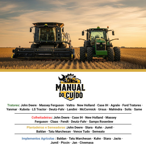 Inclui manuais técnicos completos de tratores das linhas mais usadas no agro, como John Deere, Valtra, Massey Ferguson, New Holland e outras marcas populares da roça — com informações detalhadas de motor, transmissão, sistema hidráulico, elétrica e manutenção pesada.